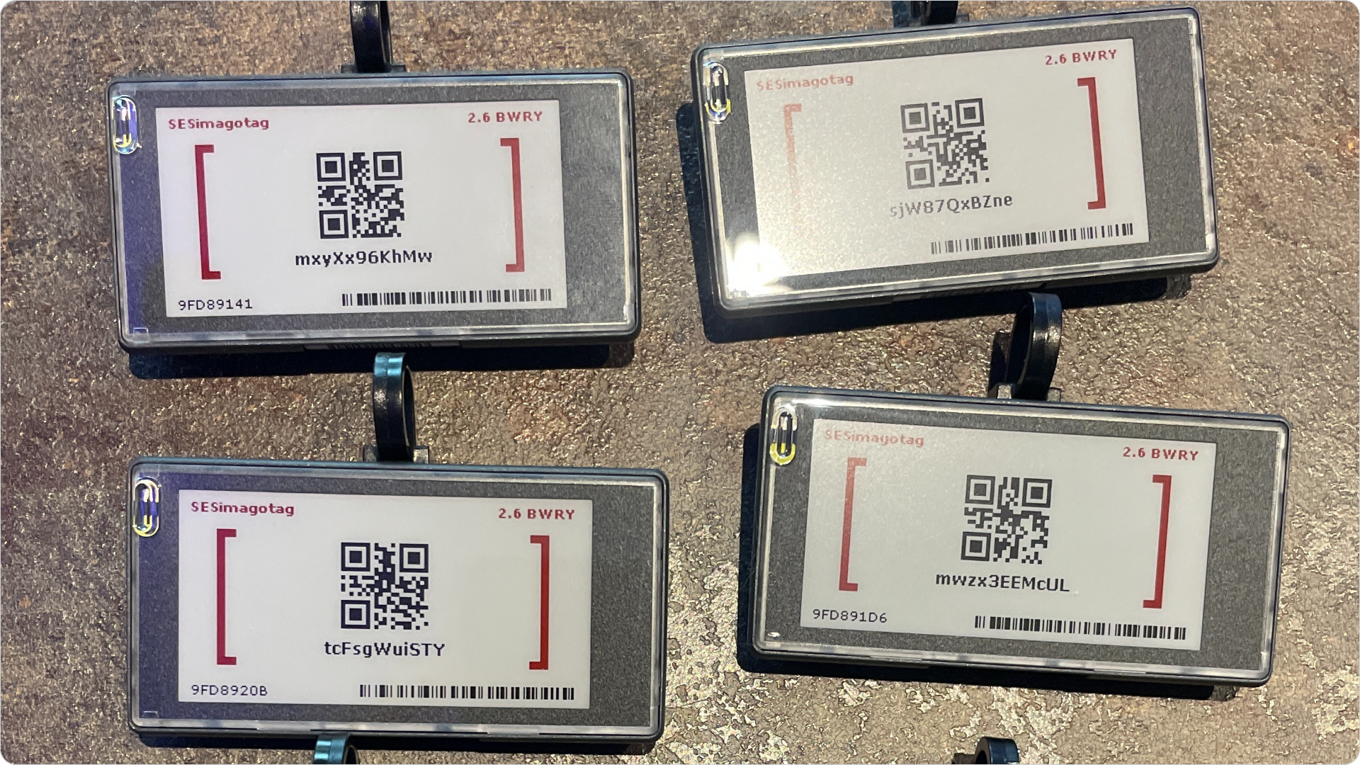 E-ink - clear in all lighting. Supports black, white, red, and yellow.
